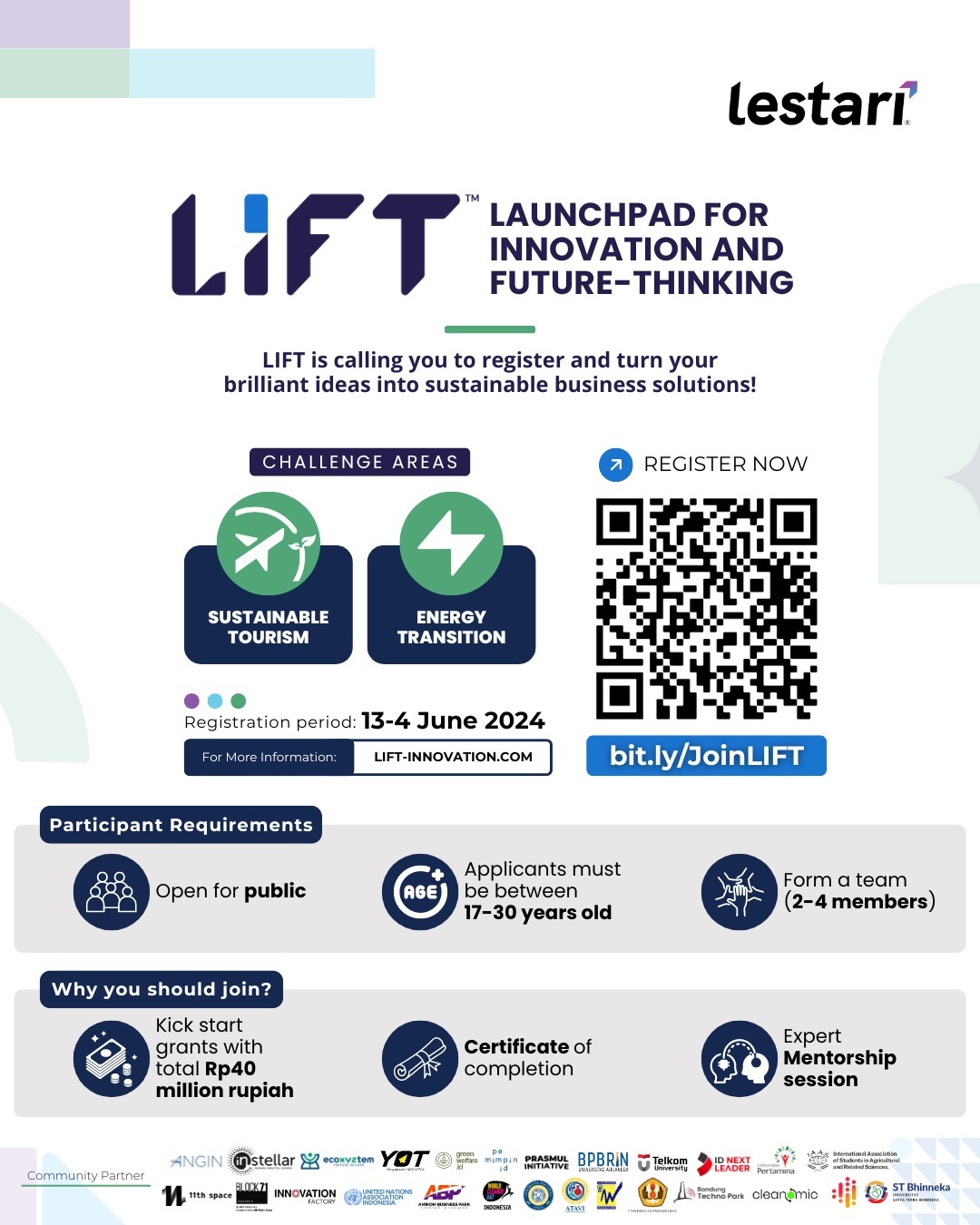 And get the chance to secure kick-start grants totaling Rp40 million, expert mentorship, and networking within the Lestari impact ecosystem.